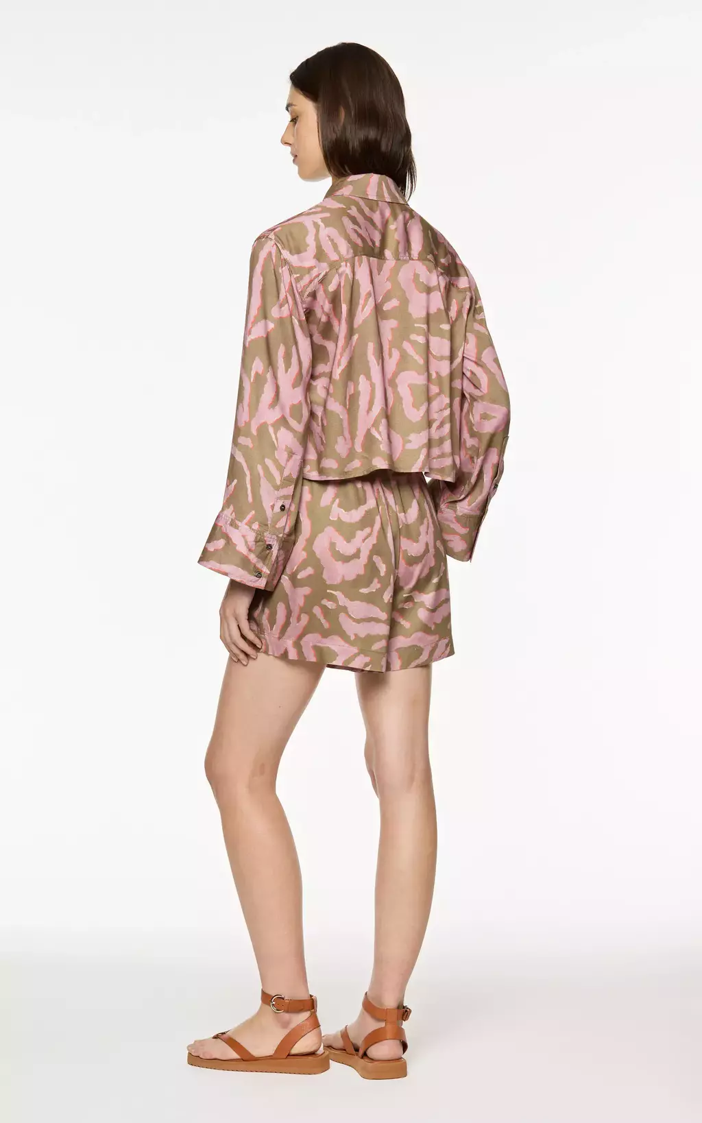 Camisa amplia de tela plana estampada, cartera a la vista con botones personalizados. Hombro caído y mangas largas amplias con puño ancho. Posee corona marcaria estampada en hd. Textil fabricado en brasil. Su corte liviano y versátil la convierte en una aliada clave para armar conjuntos frescos con estilo propio.