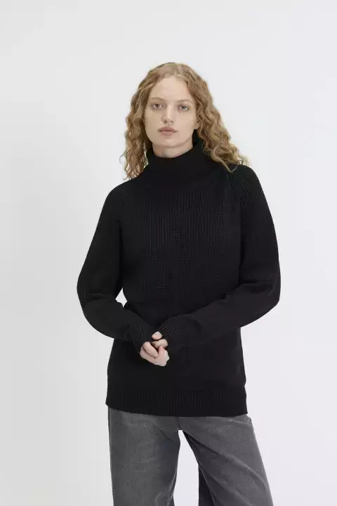 Sweater de cuello alto confeccionado en una combinación de punto inglés y jersey, brindando una textura cómoda. Su diseño atemporal ofrece una silueta elegante y cálida, perfecta para los días fríos. El cuello alto no solo proporciona abrigo, sino que también añade un toque diferente al look. Ideal para combinar con cualquier prenda, es una opción versátil que combina estilo y confort.